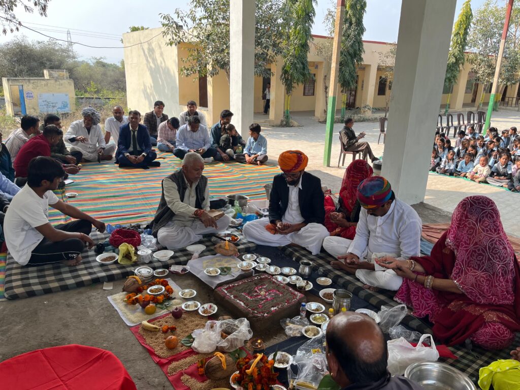 कार्यक्रम का शुभारंभ पंडित भागीरथ दास वैष्णव के सानिध्य में वैदिक विधि-विधान से हुआ। शुभ मुहूर्त में मंत्रोच्चार के साथ प्रतिमा प्रतिष्ठा सम्पन्न कराई गई। विशेष हवन में मुख्य यजमान प्रकाश वैष्णव एवं चेतन वैष्णव ने आहुतियां अर्पित करते हुए क्षेत्र की खुशहाली तथा विद्यार्थियों के उज्ज्वल भविष्य की कामना की।