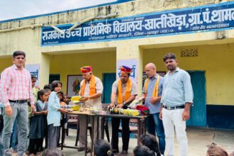 थामला के राजकीय प्राथमिक विद्यालय खातीखेड़ा में भामाशाहों ने छात्रों को वितरित की चप्पलें